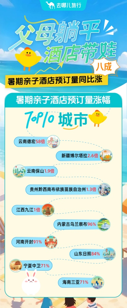 去哪儿数据显示,今年暑期亲子酒店预订量整体涨了八成,其中涨幅最大的城市有云南德宏、贵州黔西南布依族苗族自治州、江西九江、内蒙古乌兰察布、河南开封、山东日照、宁夏中卫等,均是近几年“火”起来的小众城市,其无不正在加速提升旅游配套服务。