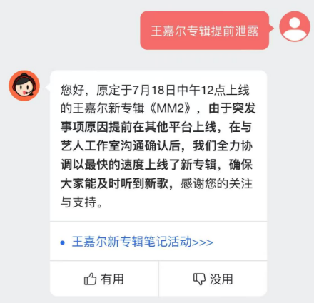 7月18日,网易云音乐客服表示:“原定于7月18日中午12点上线的王嘉尔新专辑《MM2》,由于突发事项原因提前在其他平台上线,在与艺人工作室沟通确认后,我们全力协调以最快的速度上线了新专辑,确保大家能及时听到新歌。”