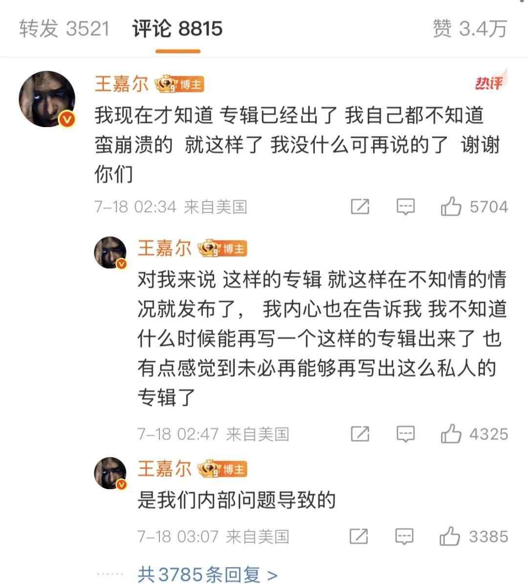 随后,王嘉尔在评论区发文:“我现在才知道,专辑已经出了,我自己都不知道,蛮崩溃的,就这样了,我没什么可再说的了,谢谢你们。”