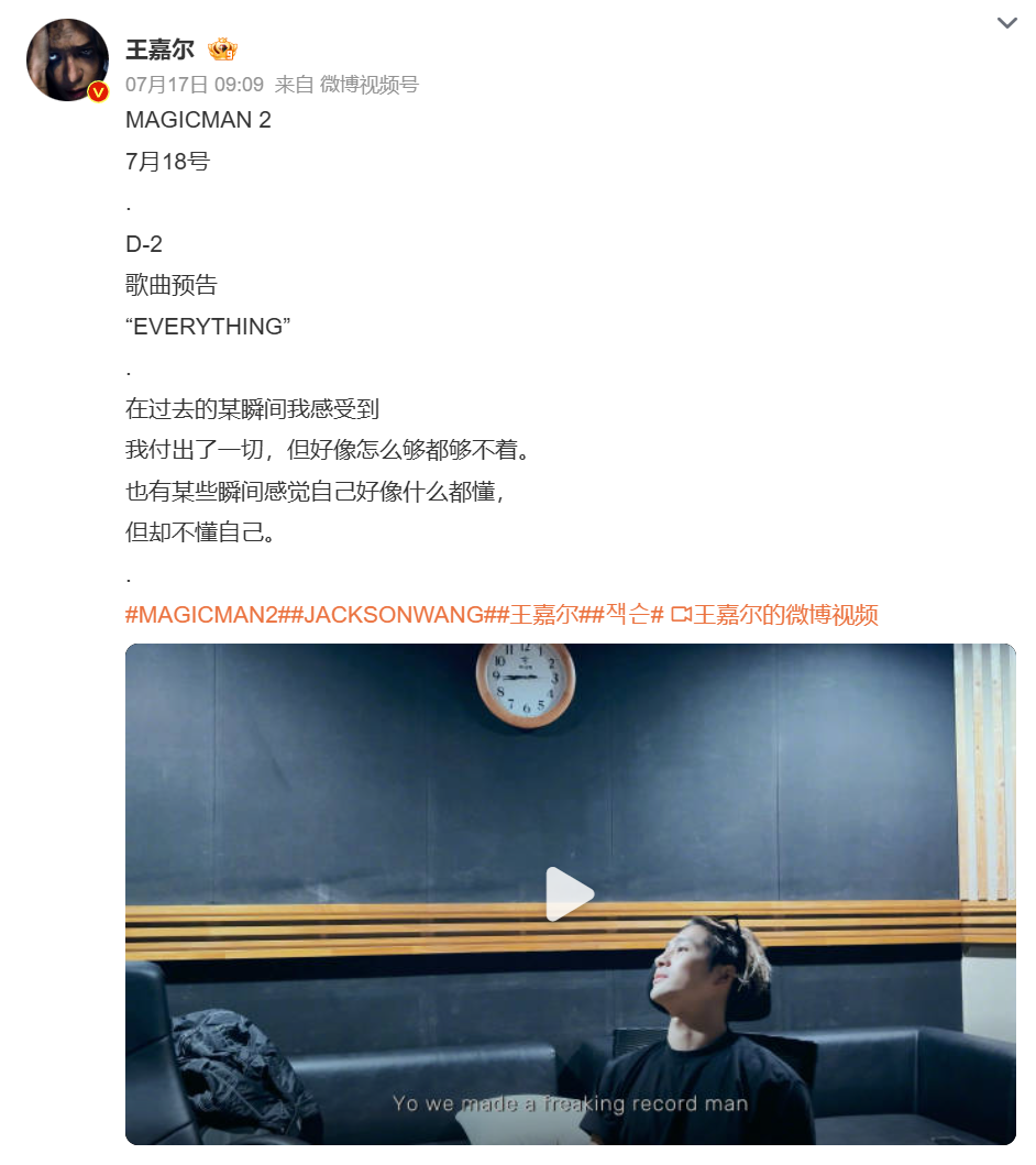 7月17日,歌手王嘉尔发文预告,新专辑原定于18日中午12点上线。
