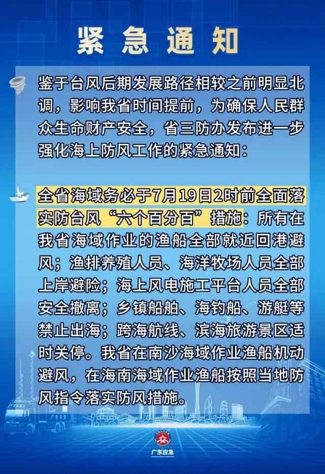 昨日(7月17日),广东省防汛防旱防风总指挥部办公室(简称“省三防办”)已印发通知,要求各地各部门做好当前热带低压防御工作。鉴于台风后期发展路径相较之前明显北调,影响广东时间提前,为确保人民群众生命财产安全,省三防办于18日再次发布进一步强化海上防风工作的紧急通知: