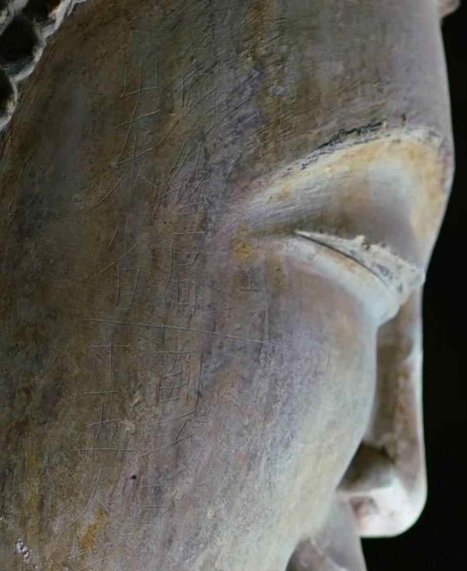 近日,有网友在社交媒体上发布消息称,其在参观神通寺四门塔时,拍摄了一张佛像的照片,放大后发现佛像的头部有刻字。据该名网友发布的图片,佛像头部刻有“某某省测绘局十五人”等字样。
