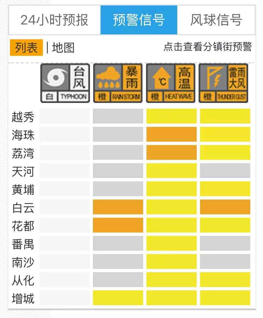截至7月18日17时12分,广州台风、暴雨、高温和雷雨大风四款预警信号同时生效。其中全市各区均已发布台风白色预警信号;白云、花都发布暴雨橙色预警信号,增城发布暴雨黄色预警信号;全市各区皆发布高温黄色或以上预警信号,其中海珠、荔湾仍然发布高温橙色预警信号;除番禺、南沙、天河外,广州其余各区均发布雷雨大风黄色或以上预警信号,其中白云区发布雷雨大风橙色预警信号。由于雨势仍在发展,不排除广州各区后续继续发布或调整预警信号,请市民做好防御工作。