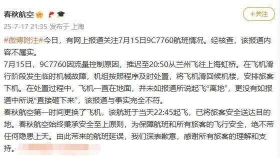“飞机起飞后砸向地面”?春秋航空回应:不实