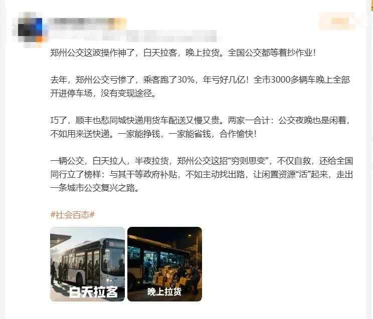 近日,网友在社交媒体平台发文,对郑州公交与顺丰集团的合作表达赞许:“一辆公交,白天拉人,半夜拉货,郑州公交这招‘穷则思变’,不仅自救,还给全国同行立了榜样”。该网友还表示,城市公交企业与其等政府补贴,不如主动找出路,让闲置资源“活”起来。