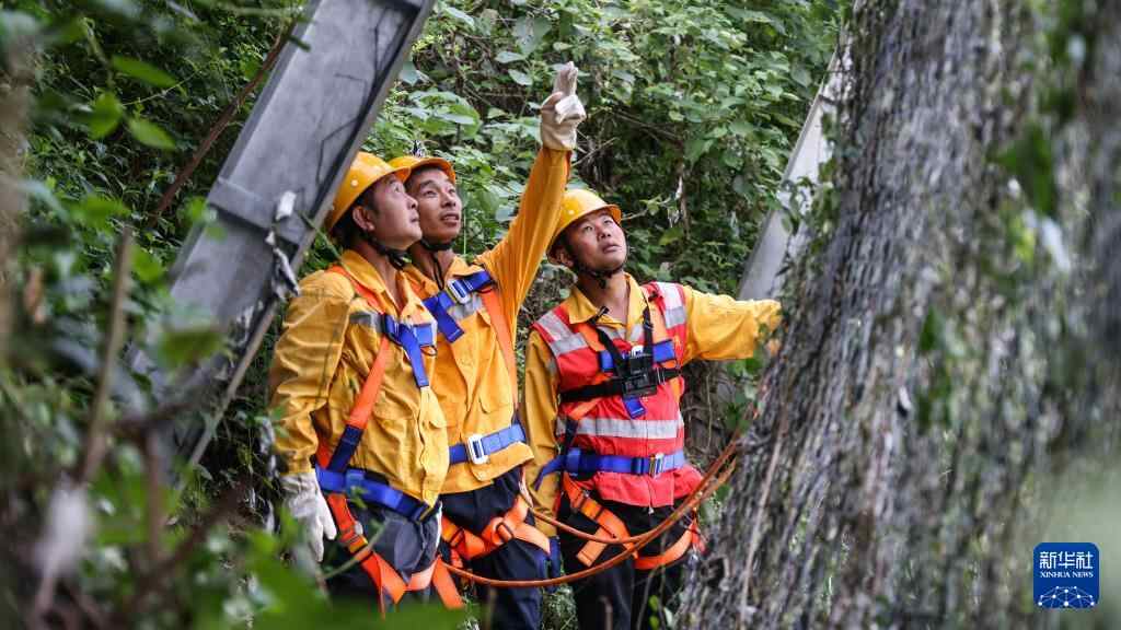 桥隧工人清除被动网上的藤蔓和杂草(7月15日摄,无人机照片)。