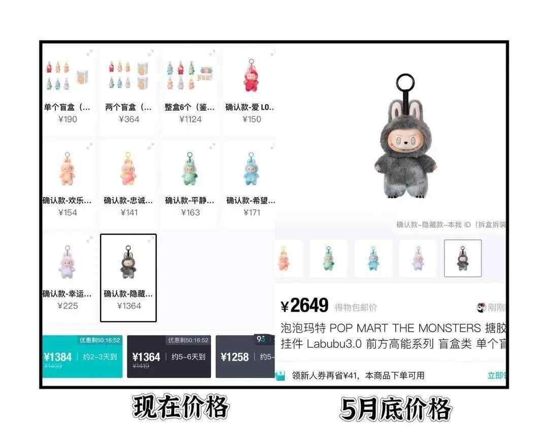 记者发现,2个月后的今天,LABUBU3.0相比此前价格已经回落50%,普通款盲盒150元左右一个,隐藏款1300元左右能买到。有业内人士表示:“因为LABUBU3.0持续放货,很多人原价都能抢到,因此价格随之降低,相反LABUBU1.0因为更为稀缺,价格已经超过了LABUBU3.0。”