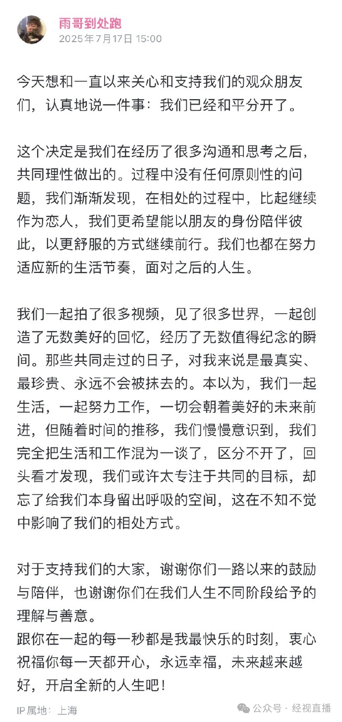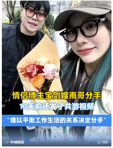 7月17日,B站百大up主“宝剑嫂”和“雨哥到处跑”官宣分手,结束7年恋情。相关话题迅速登上热搜。