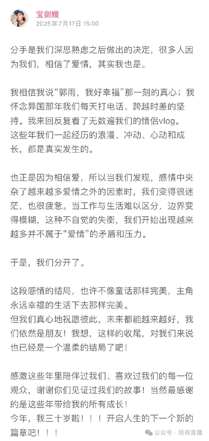 宝剑嫂表示:“这段感情的结局,也许不像童话那样完美,主角永远幸福地生活下去那样完美。但我们真心地祝愿彼此,未来都能越来越好,我们依然是朋友!我想,这样的收尾,对我们来说也已经是一个温柔的结局了吧!”