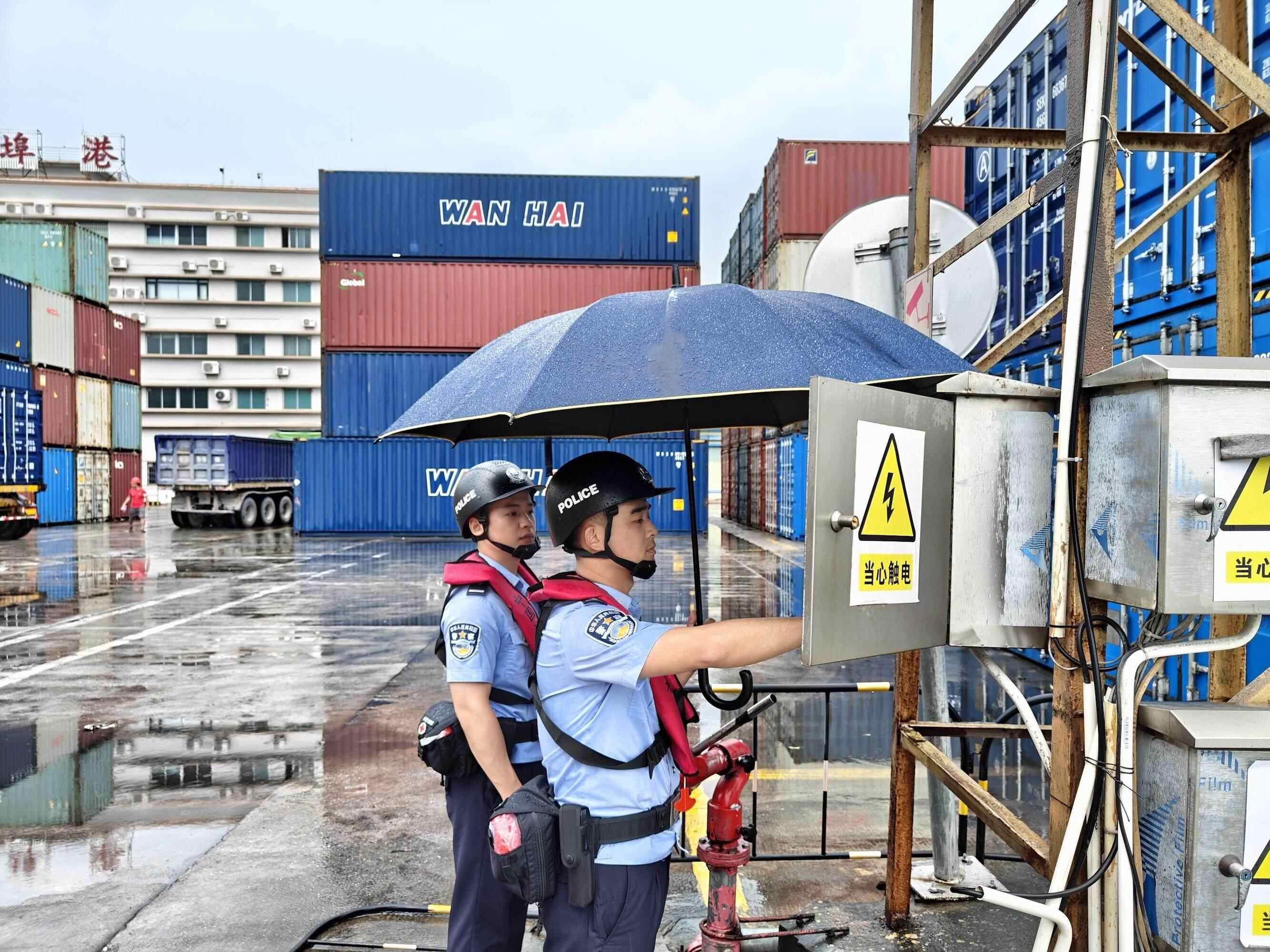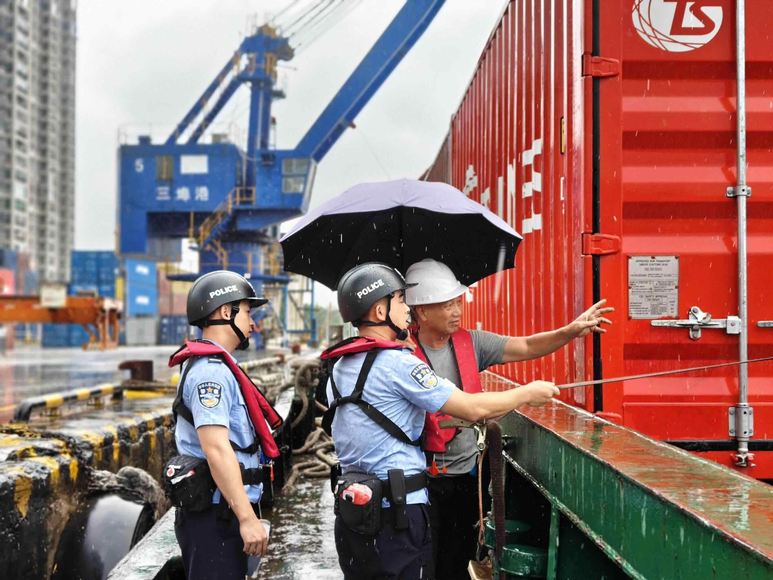 在集装箱堆场和船舶停靠点等重点区域,移民管理警察们认真开展安全隐患排查工作,对集装箱重点部位进行加固处理,防止在大风中发生位移或倒塌;协助船员加固缆绳,增加船舶稳定性,确保船舶在港内安全避风;帮助码头企业做好防台抗汛工作,督促企业落实主体责任,加强对作业人员的安全教育,提高安全意识。