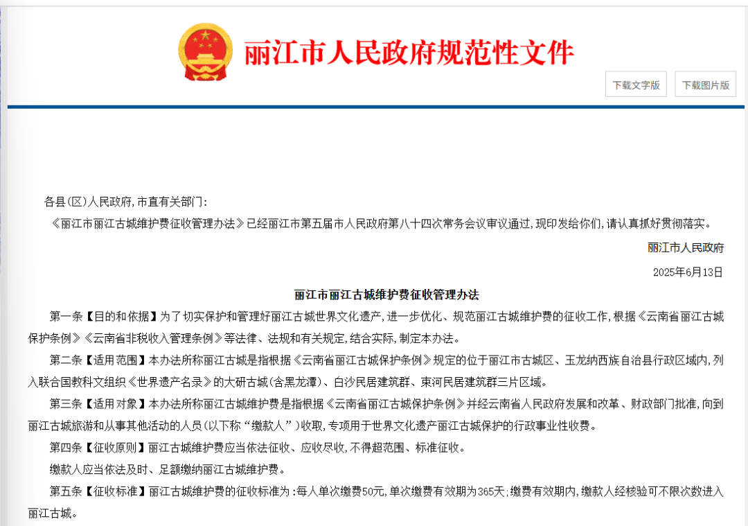 据丽江市人民政府官网发布的《丽江市丽江古城维护费征收管理办法》(下称“办法”),此次新规征收范围:涵盖大研古城(通俗意义上的丽江古城)、白沙民居建筑群、束河民居建筑群三片区域,即丽江古城景区的核心区域。