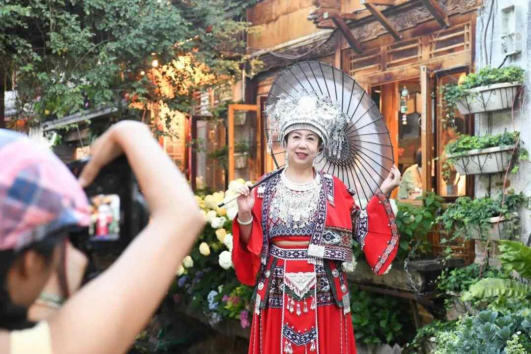 身着民族服装的游人在云南丽江古城拍照 (图源:新华社)