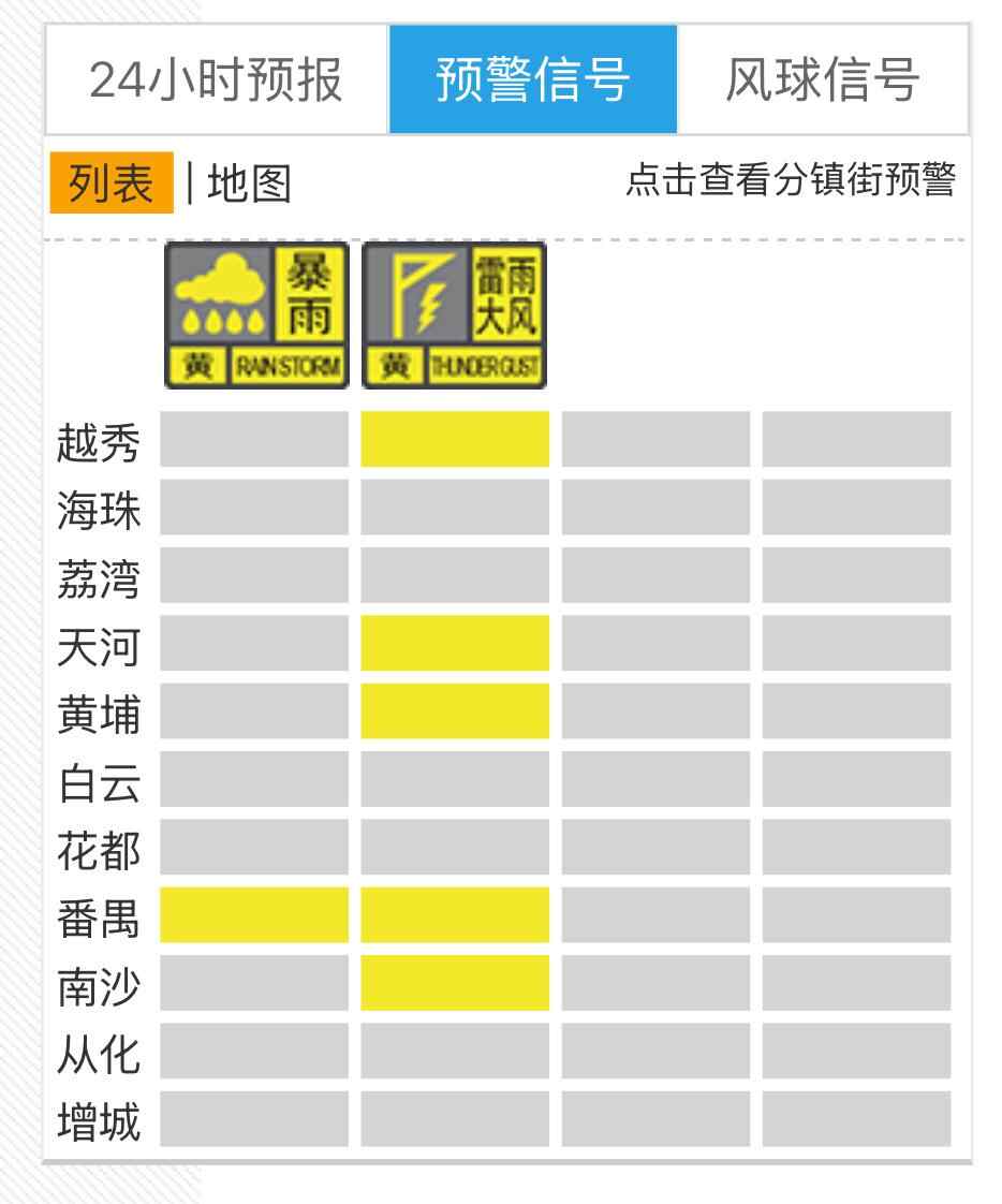 截至7月13日14时27分,越秀、天河、黄埔、番禺、南沙发布雷雨大风黄色预警信号,番禺发布暴雨黄色预警信号。由于雨势仍在发展,不排除广州各区后续继续发布或调整预警信号,请市民做好防御工作。