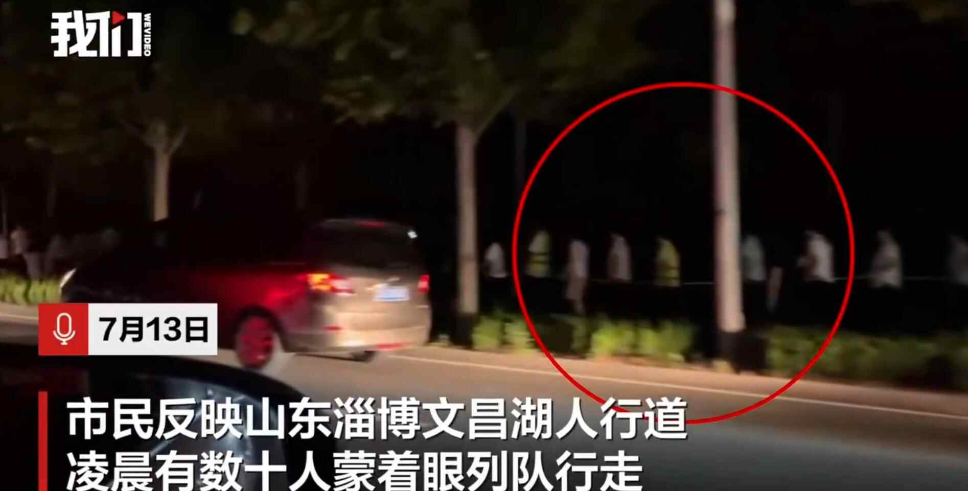 7月13日,有市民反映在山东淄博文昌湖景区附近,凌晨有数十人蒙眼列队行走。
