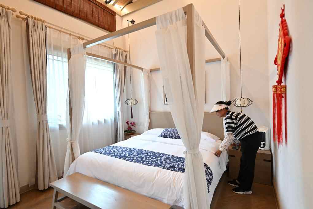 7月4日,阜平县骆驼湾村精品民宿的工作人员在整理房间。新华社记者 李鑫 摄