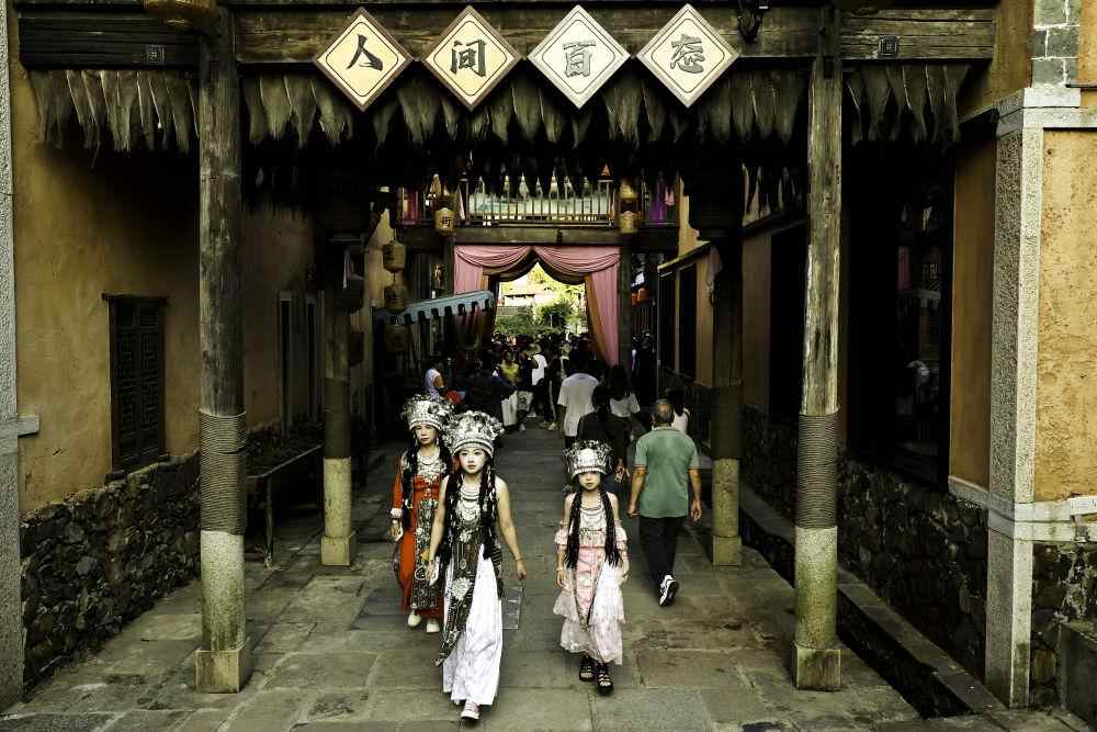 夜幕降临,记者随“活力中国调研行”采访团来到景区,远处悬崖灯火璀璨,如影视剧一般的场景在眼前浮现。游客或沉浸式体验情景剧、舞蹈剧、杂技等演出,或身着古装拍照打卡,在热闹的氛围里感受“仙侠世界”的浪漫。