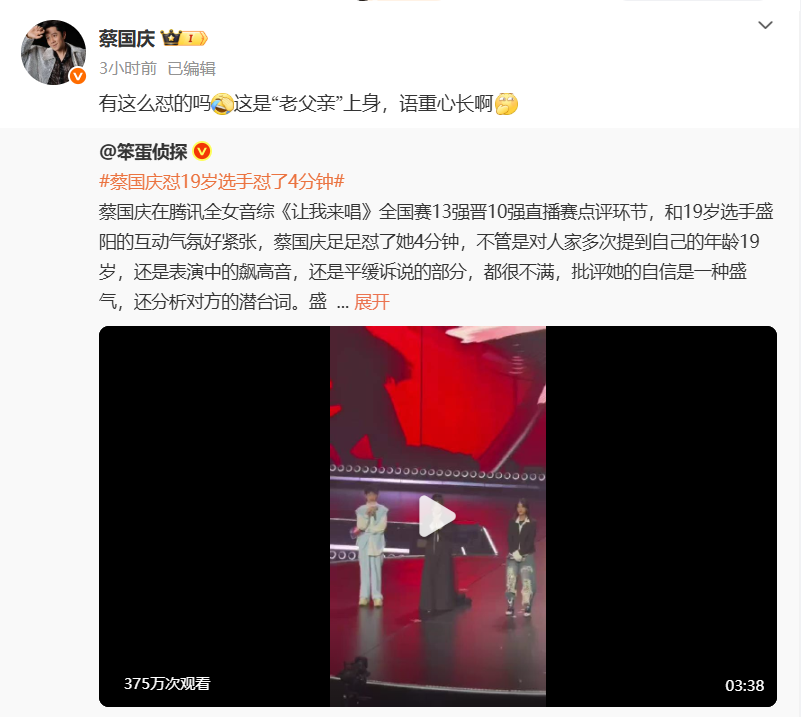 7月13日,话题“蔡国庆怼19岁选手怼了4分钟”冲上微博热搜榜单。