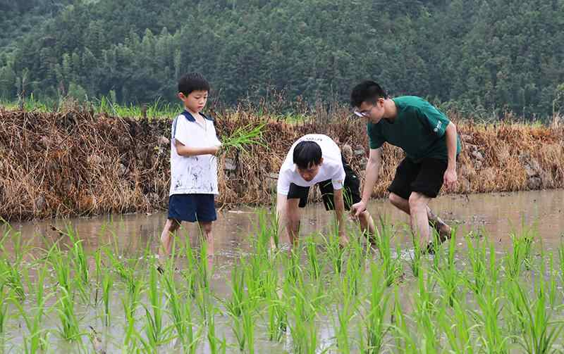 浙江大学大学生志愿者和孩子们走进田间地头,在“护苗学堂”劳动辅导员带领下,学习插秧技术和水稻管理方法,体验农耕文化,珍惜来之不易的粮食,在红土地上播种希望,收获成长。图为大学生志愿者和孩子一起体验插秧。