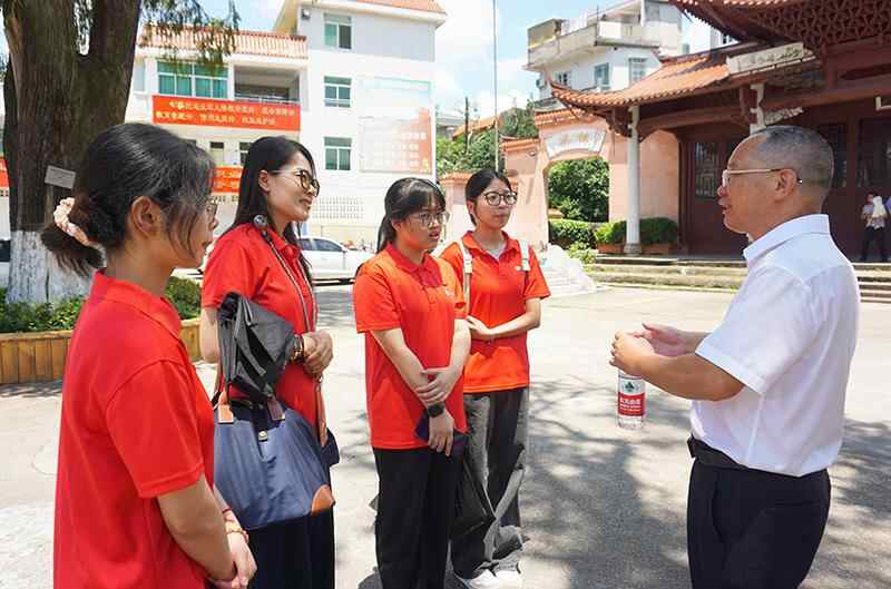 三明学院教育与音乐学院“战时师魂传承队”师生一行,前往长汀、永安、大田三地,开展“溯源战时内迁教育,传承抗战师魂新章”暑期社会实践活动。图为队员们采访林文清老师,并收集相关史实资料。