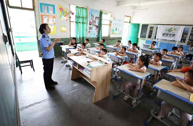 支教期间,各方社会力量积极参与,以青春之力护苗成长。图为福建省永安市公安局罗坊派出所三级警长黄倩为孩子们科普反诈常识,提高他们的科学素养,有效防范诈骗行为。