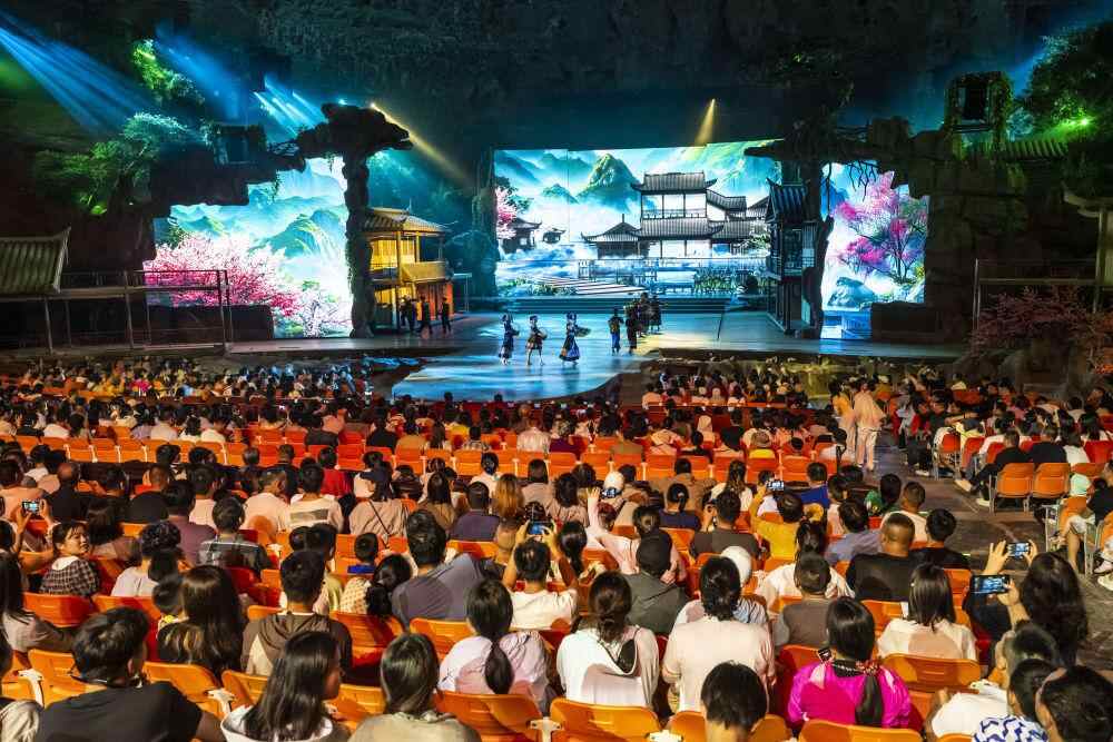 7月10日,游客在利川市腾龙洞的洞穴内观看实景剧《夷水丽川》。新华社发(郑家裕 摄)