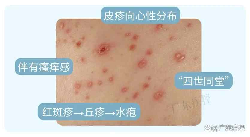 向心性分布:先见于躯干(皮疹最多)、头部,后延及全身。“变形”非常迅速:皮疹开始为红斑疹,数小时变为丘疹,接着迅速发展为水疱。瘙痒感:皮疹伴有瘙痒感,夜间更为明显。抓挠还可能引起继发性细菌感染。“四世同堂”:同一部位可见斑疹、丘疹、疱疹和结痂同台“争奇斗艳”。