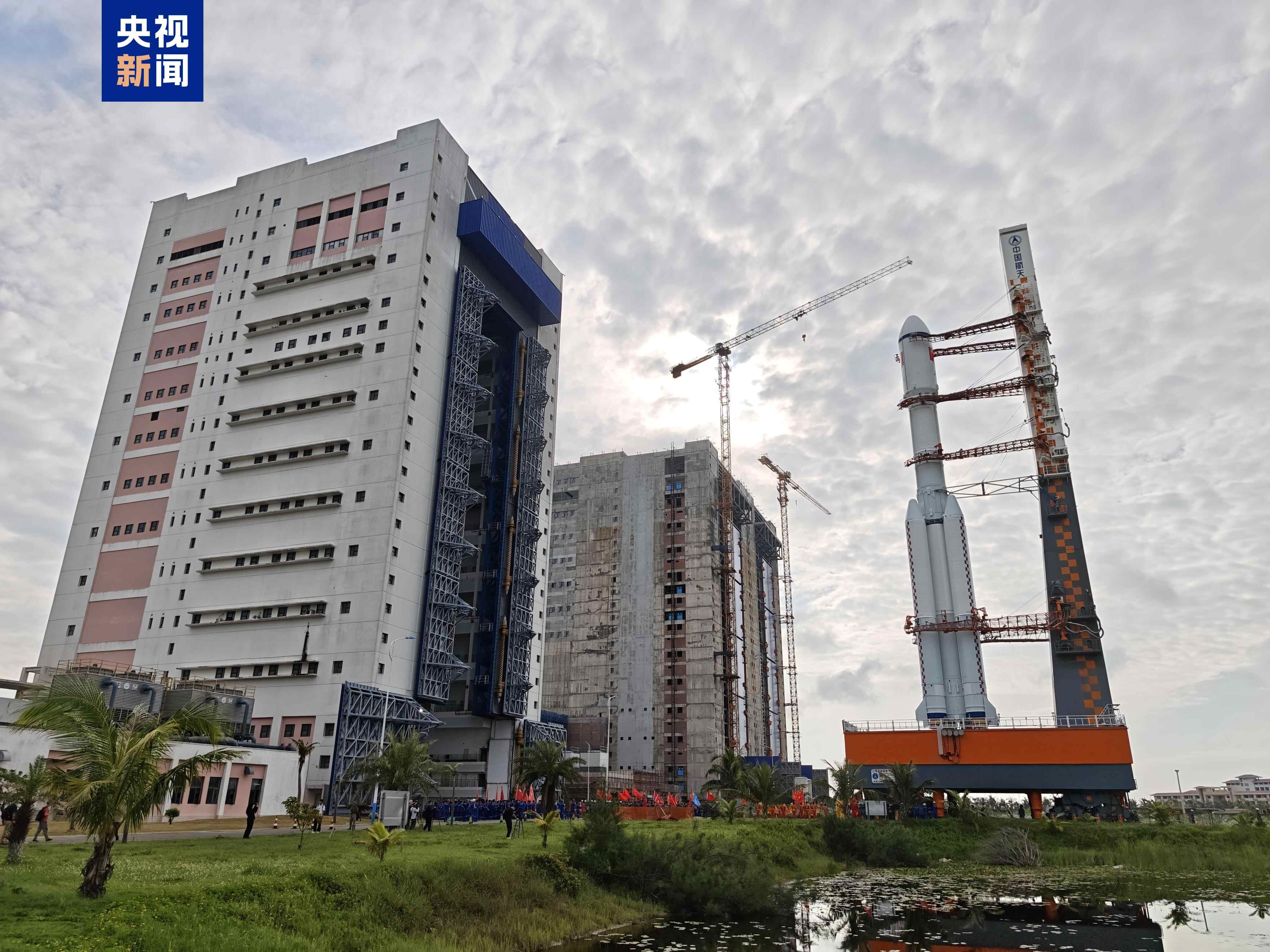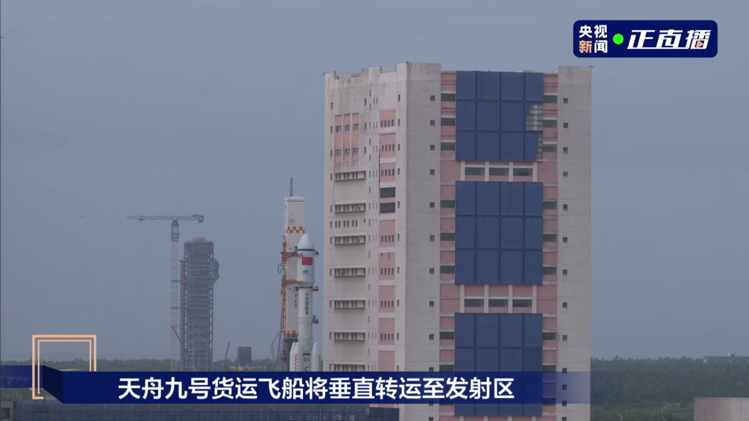 天舟九号货运飞船与长征七号遥十运载火箭组合体向发射区垂直转运