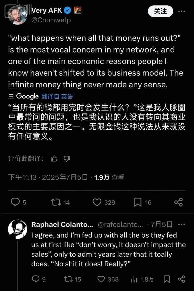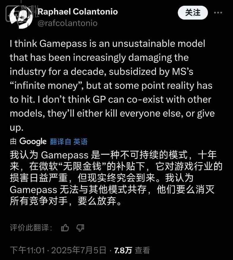 作为一名开发者,拉斐尔的观点是:XGP走得是“卷王”道路,要么把其他模式都卷死,要么自己灰溜溜地退场,不是个可持续的模式。他表示,这种模式纯靠微软雄厚的“无尽财力”支撑,迟早会将矛盾一口气爆发出来。