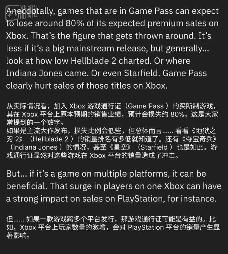 在2023年,微软为了收购动视暴雪和英国当局扯皮时,当局发布报告指出“微软称,其内部游戏在加入XGP的头12个月,销量(较未加入)下降了一定比例”。出于保密,报告并未给出具体数字,也引发了不少猜测。