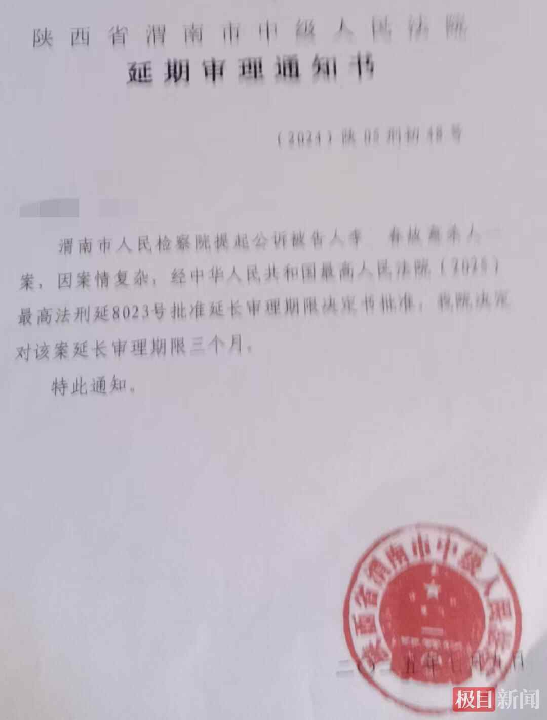 今年7月9日,渭南中院出具延期审理通知书,让案件审理再次延期。通知书显示:渭南市人民检察院提起公诉的被告人李某春故意杀人一案,因案情复杂,经最高人民法院(2025)最高法刑延8023号批准延长审理期限决定书批准,渭南中院决定对该案延长审理期限三个月。吴先生称,这是该案一审开庭审理后,第二次延期审理。