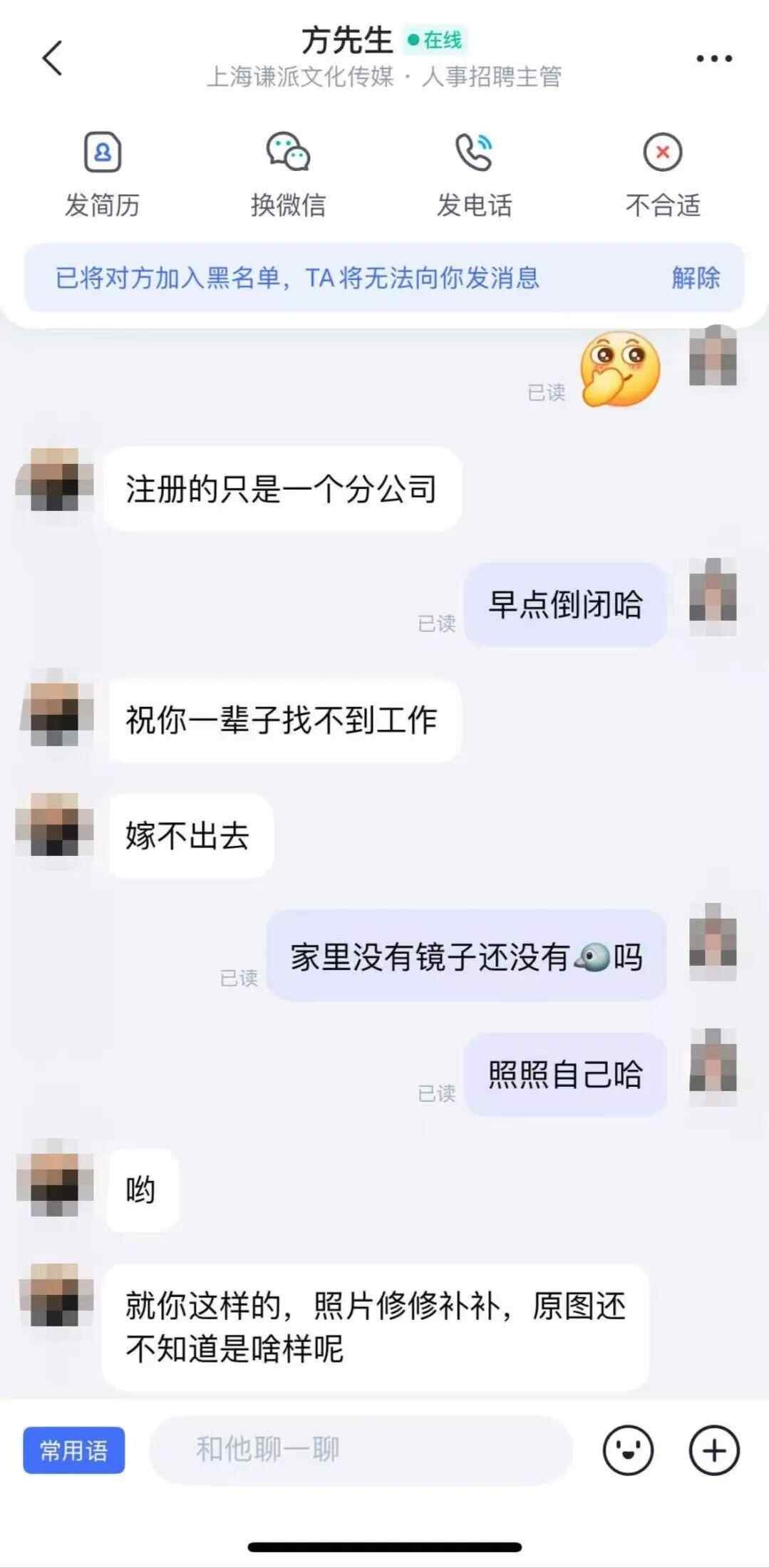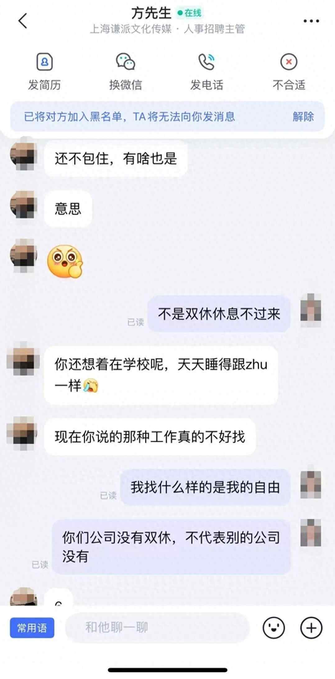 7月11日,上海的朱女士告诉记者,她在招聘软件上找工作,向上海谦派文化传媒有限公司投递了简历,人事招聘主管方先生介绍了基本的工作情况后,李女士询问公司是否有双休,却遭到了对方辱骂,并且歧视自己学历。