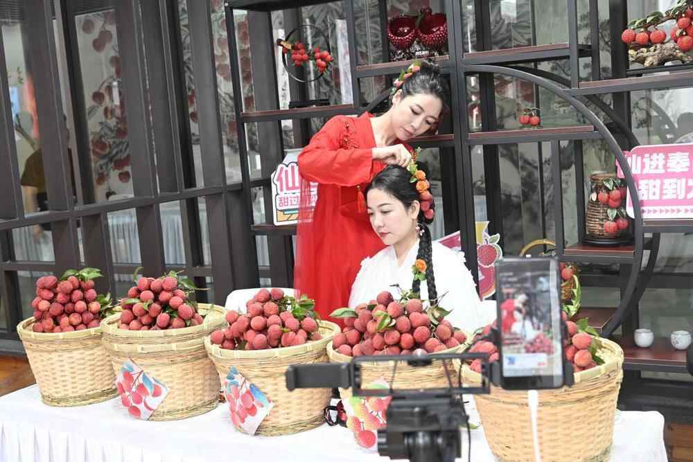 陈爽(爽贵妃)、吴宛璟(小宛玉)等文旅推荐官,分别通过仙进奉荔枝盘发和双人大唐荔枝舞等,推介增城仙进奉荔枝。她们或精彩表演,或深情讲述,或风趣介绍,将荔枝的香甜与旅游的乐趣完美结合,让观众在欢笑中感受到了荔枝文化的魅力。