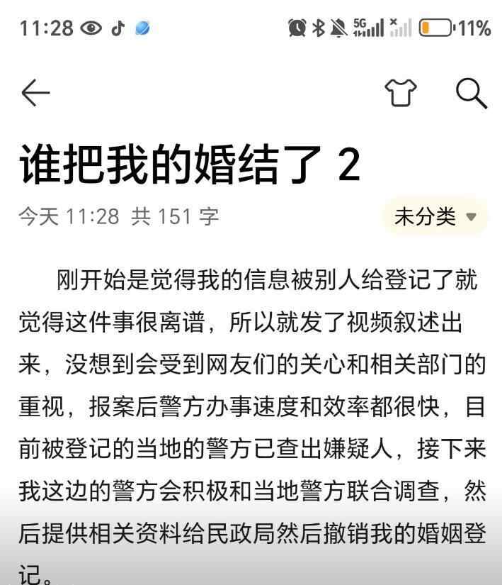 7月10日,云南文山市的罗女士办理退税时发现自己8年前在安徽马鞍山“被结婚”了,但她与结婚登记证上的“丈夫”完全不认识,也从未去过安徽。7月12日上午11时30分许,罗女士在社交平台上再次发声表示,目前含山县警方已查出嫌疑人,接下来文山警方会积极和含山警方联合调查。