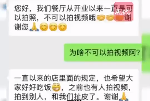日前,有网友在上海一家餐厅用餐时,她用手机对着正在烹饪的厨师,拍摄了一条6秒时长的视频。随后,手机上就收到了餐厅工作人员发来的微信消息,提醒在餐厅内只可拍照,不可以拍视频。