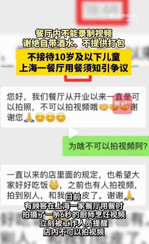 记者查阅看到,这家上海餐厅的用餐须知共有7条,共350多字,除了禁止拍视频外,还有禁止直播和电话外放,订餐需缴纳定金500元/人,用餐前72小时内取消预约不予退还;不接待10岁以下儿童、不提供打包、禁用香水、禁带宠物等多条规定。