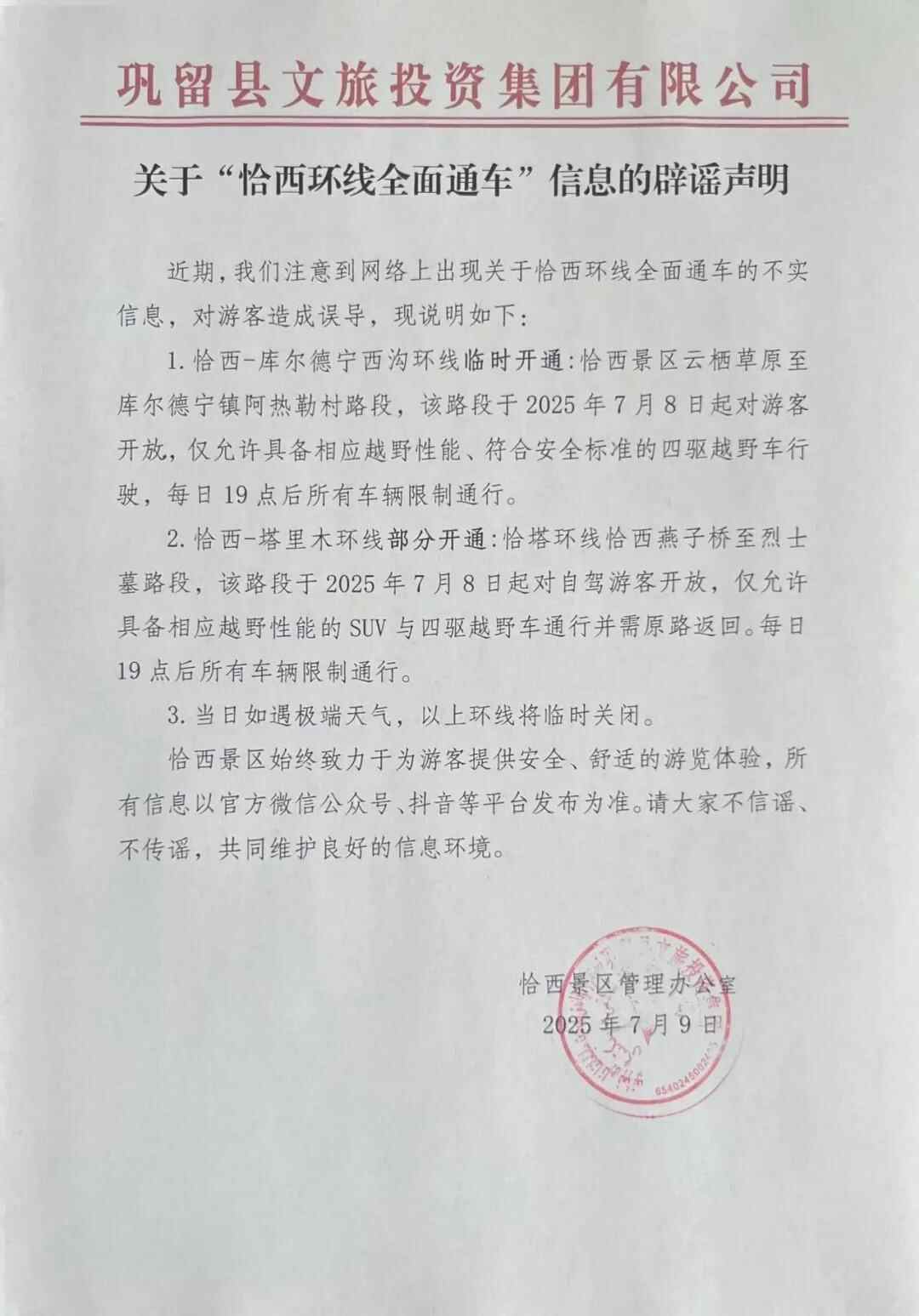近日,有网民发布信息称“恰西环线全面通车”,引发关注讨论。经恰西景区管理办公室核实,该内容不属实。