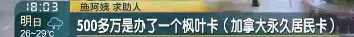 施阿姨:“我问她900万的资金流向,她说200多万是被中介骗了,500多万是办了一个枫叶卡(加拿大永久居民卡)。我就怕那个房产做了抵押,人家要来收我们的房子,拍卖我们的房子,到时候我们两个老人怎么办?去哪里住?我们的权益谁来保障?”