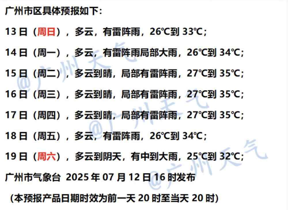结合广州市气象台7月12日预计,副高逐渐加强,广州渐趋炎热,午后有雷阵雨,局部雨势大并伴有短时大风、雷电等强对流天气。按现有气象资料展望,15日至17日,广州市区最高气温将达到35℃。展望18日起,广州可能受新的热带系统外围环流影响,雷雨又趋明显。