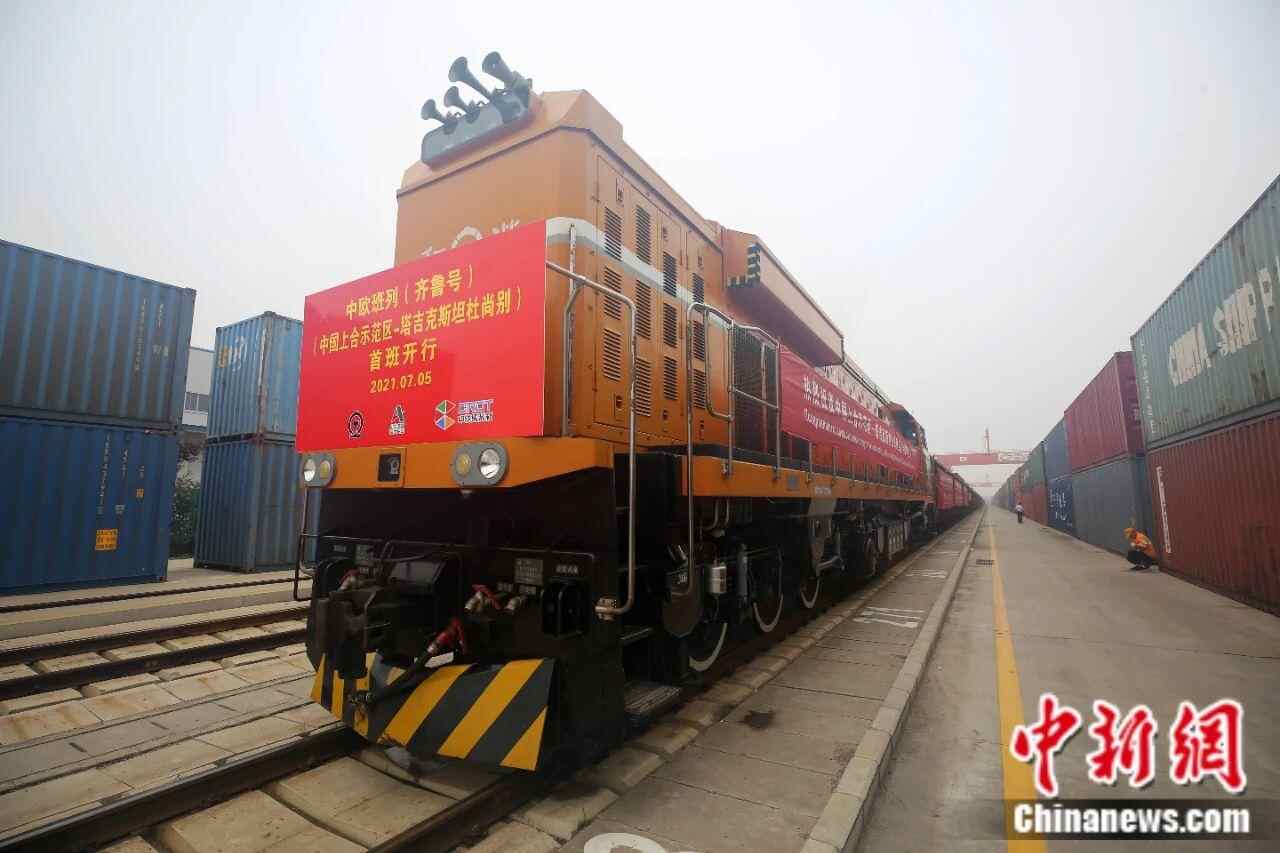 2021年7月5日, 中国—上海合作组织地方经贸合作示范区(简称“上合示范区”)前往塔吉克斯坦首都杜尚别的首班中欧班列(齐鲁号)“上合快线”发出,从上合示范区青岛多式联运中心启程。中新社记者 胡耀杰 摄