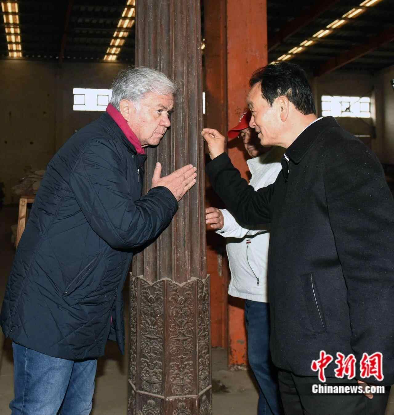 2018年11月7日,拉希德·阿利莫夫(左一)作为时任上合组织秘书长,来到安徽蚌埠“湖上升明月”中华古民居博览园参观考察。图为拉希德·阿利莫夫在细细倾听来自敲打老木头的声音。中新社发 钟欣 摄