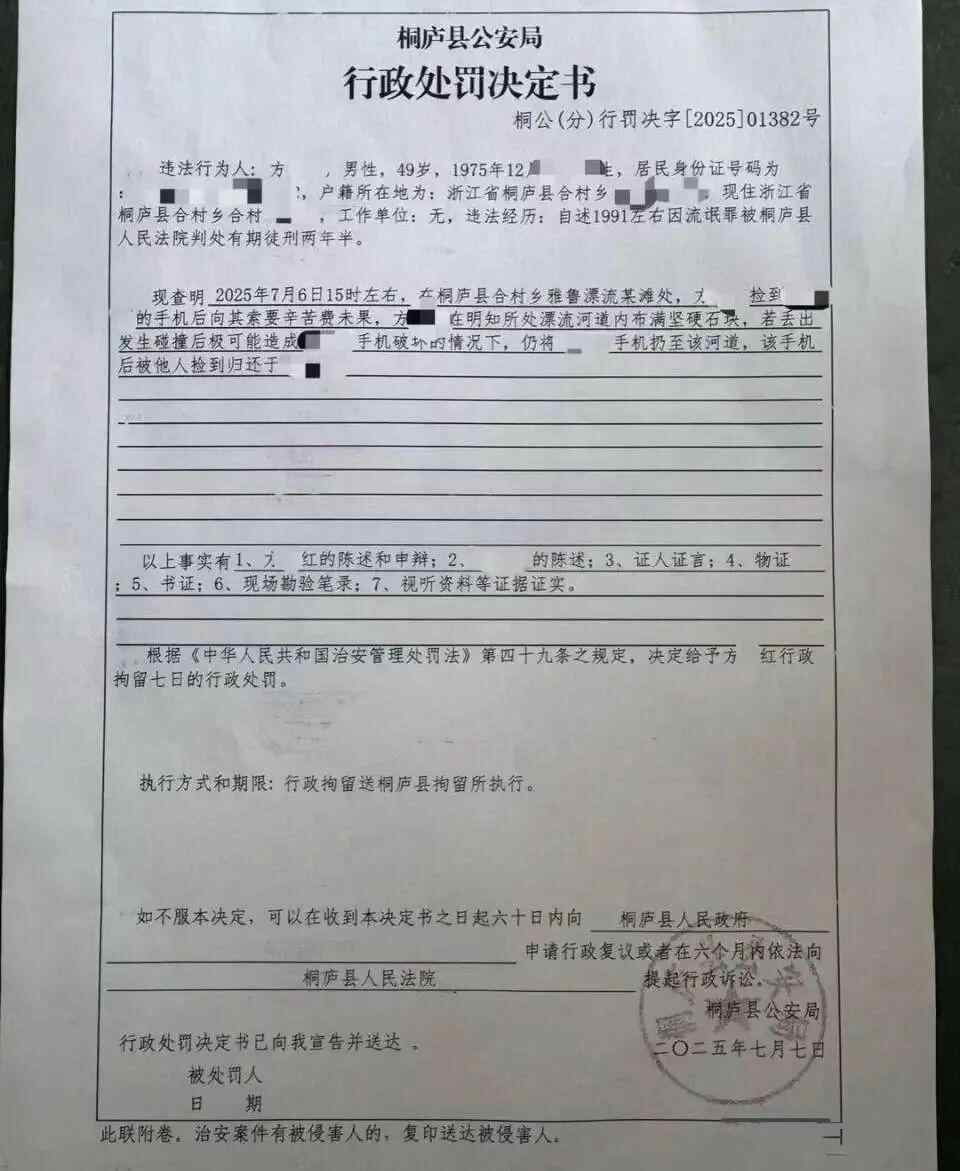 近日,有网友发帖称,在杭州桐庐雅鲁漂流景区漂流时手机落水,当地村民方某打捞后因索要1500元未果,将手机又扔回水中。