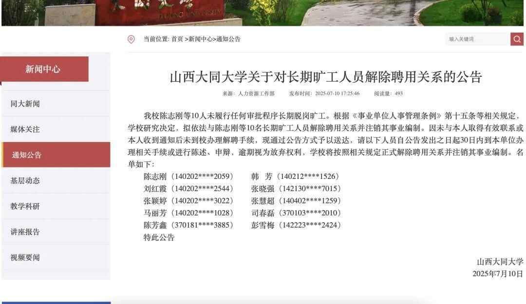 7月10日,山西大同大学发布公告,拟解聘10名长期脱岗旷工人员并注销其事业编制。7月12日,记者获悉,相关人员均为教师,截至目前暂无人与学校联系。