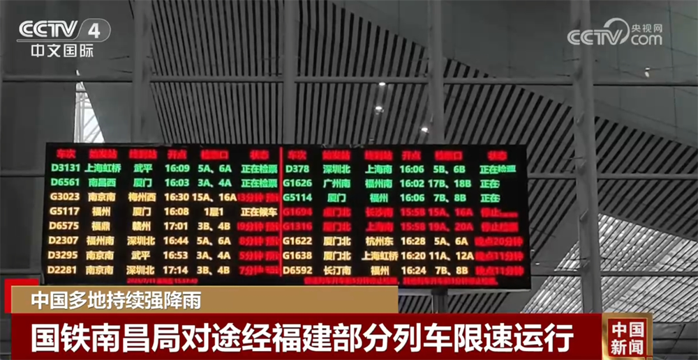 记者从国铁南昌局了解到,为应对管内福建省多地持续强降雨天气,11日,在合福高铁、福厦高铁、昌福铁路、温福铁路、福厦铁路等部分区段启动暴雨、强对流天气蓝色预警,并对途经福厦高铁、温福铁路、福厦铁路的部分旅客列车采取限速运行等安全措施,途经上述区段的部分旅客列车出现不同程度晚点。铁路部门将根据风速雨情动态调整列车运行方案,提醒旅客密切关注铁路12306平台及车站公告,合理安排出行计划。