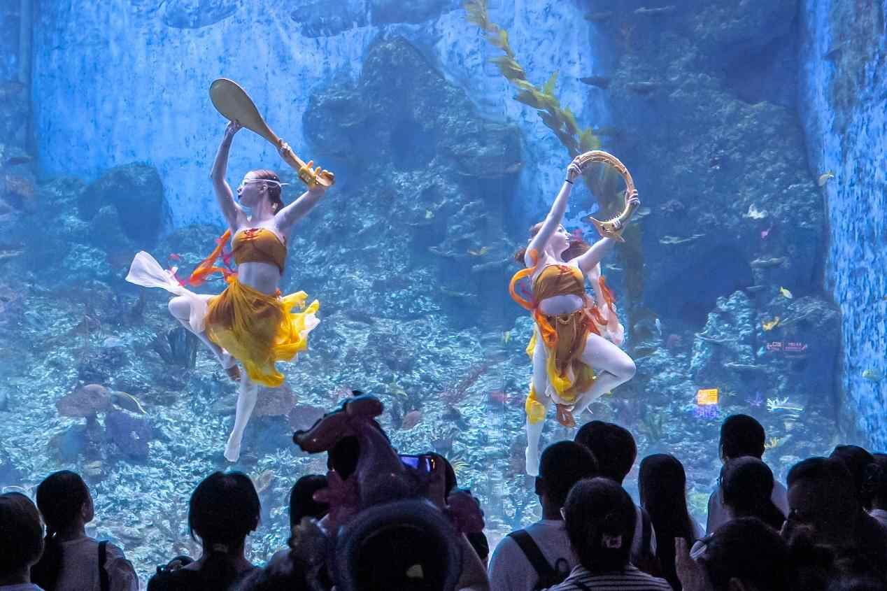 灵感取材于敦煌壁画的人鱼表演《水舞敦煌》于7月12日上线,融合了敦煌飞天文化与现代舞蹈艺术。7月12日起,逢周六日新增美人鱼合影环节,美人鱼化身白雪公主、花仙子、哪吒、小龙女等经典角色与游客互动。