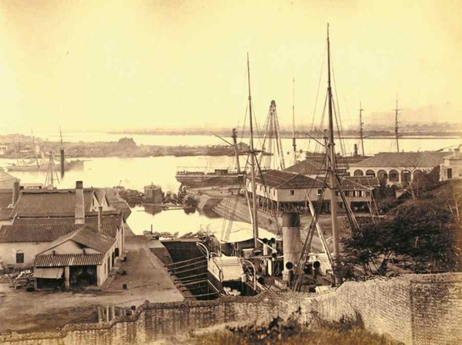 黄埔港外资船舶工业:1840-1911年外资工业建设集中在白鹅潭仓储工业区以及黄埔港船舶工业区。黄埔港自古以来总握外洋交通,是广州重要的对外贸易枢纽,清代实行一口通商政策后,黄埔港实际成为唯一合法的对外开放的港口。第一次鸦片战争后,外商航运势力迅速在黄埔港扩张,停泊于黄埔港的外轮不断增加,黄埔原有的手工修船业已不适应形势需要。19世纪40年代起,外商开始在黄埔投资创办船舶修造业,英国人柯拜最先在黄埔雇佣当地人设立柯拜船坞公司,中国第一代产业工人也在此诞生;此后相继建立录顺船坞、旗记船厂等,至同治二年(1863年)广州已有外资船坞10座,黄埔港逐渐成为近代外资船舶工业的聚集区。