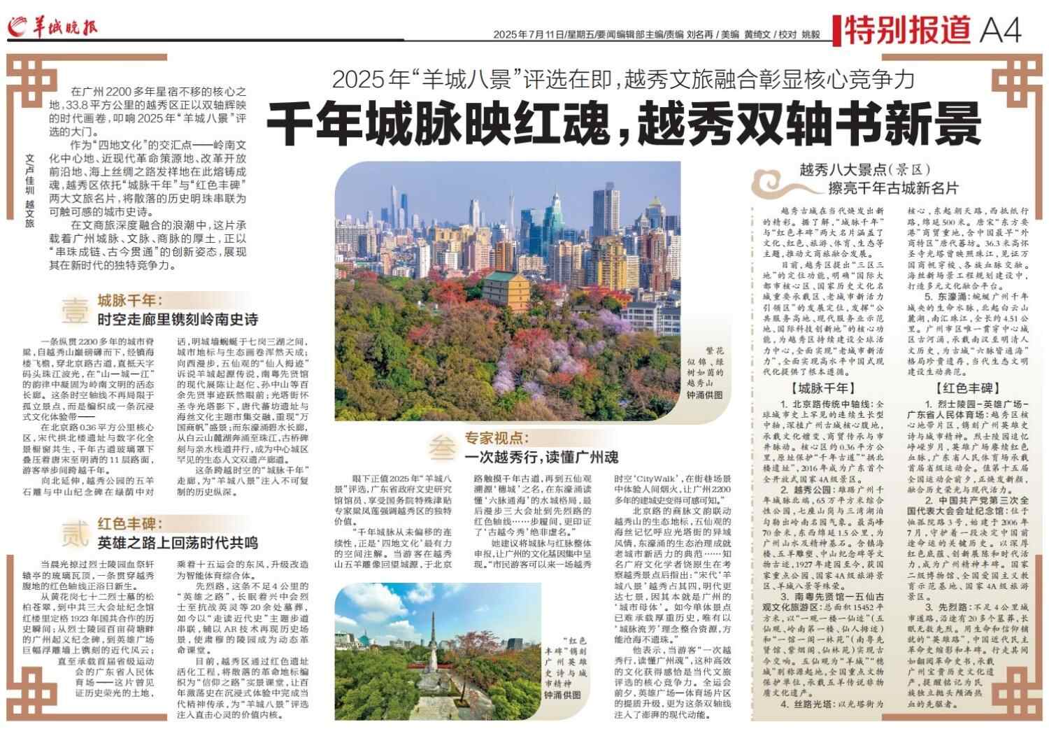 越秀古城在当代焕发出新的精彩。据了解,“城脉千年”与“红色丰碑”两大名片涵盖了文化、红色、旅游、体育、生态等主题,推动文商旅融合发展。