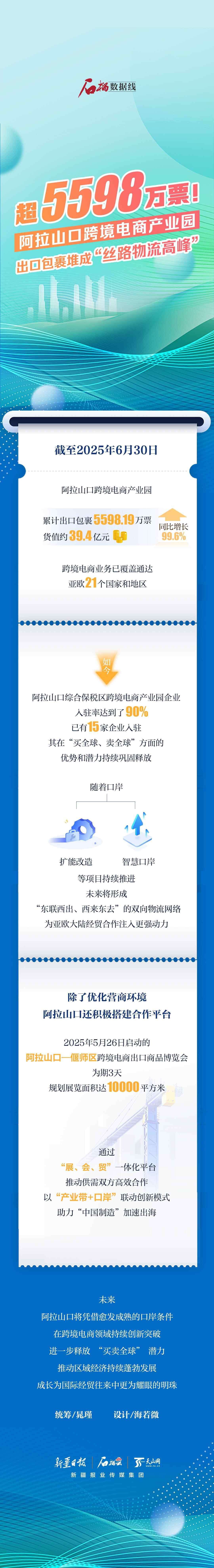 截至2025年6月30日,阿拉山口跨境电商产业园累计出口包裹5598.19万票,货值约39.4亿元,同比增长99.6%,跨境电商业务已覆盖通达亚欧21个国家和地区。