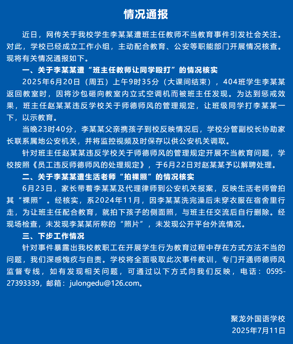 7月11日,福建泉州聚龙外国语学校发布情况通报: