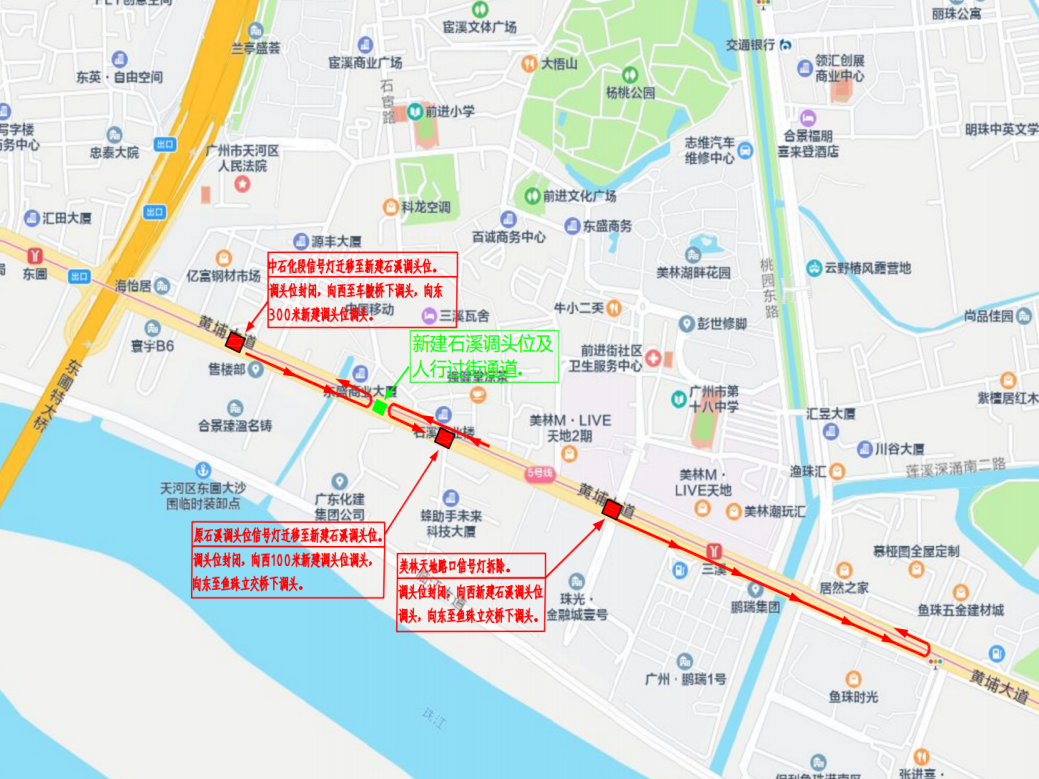 在中石化加油站段双向调头位及人行过街通道封闭后,计划启动黄埔大道东美林天地段的双向调头位及人行过街通道、路口左转的永久封闭。需调头的车辆可在新建的石溪调头位和鱼珠立交桥下调头,行人过街则可通过新建的人行天桥通行。