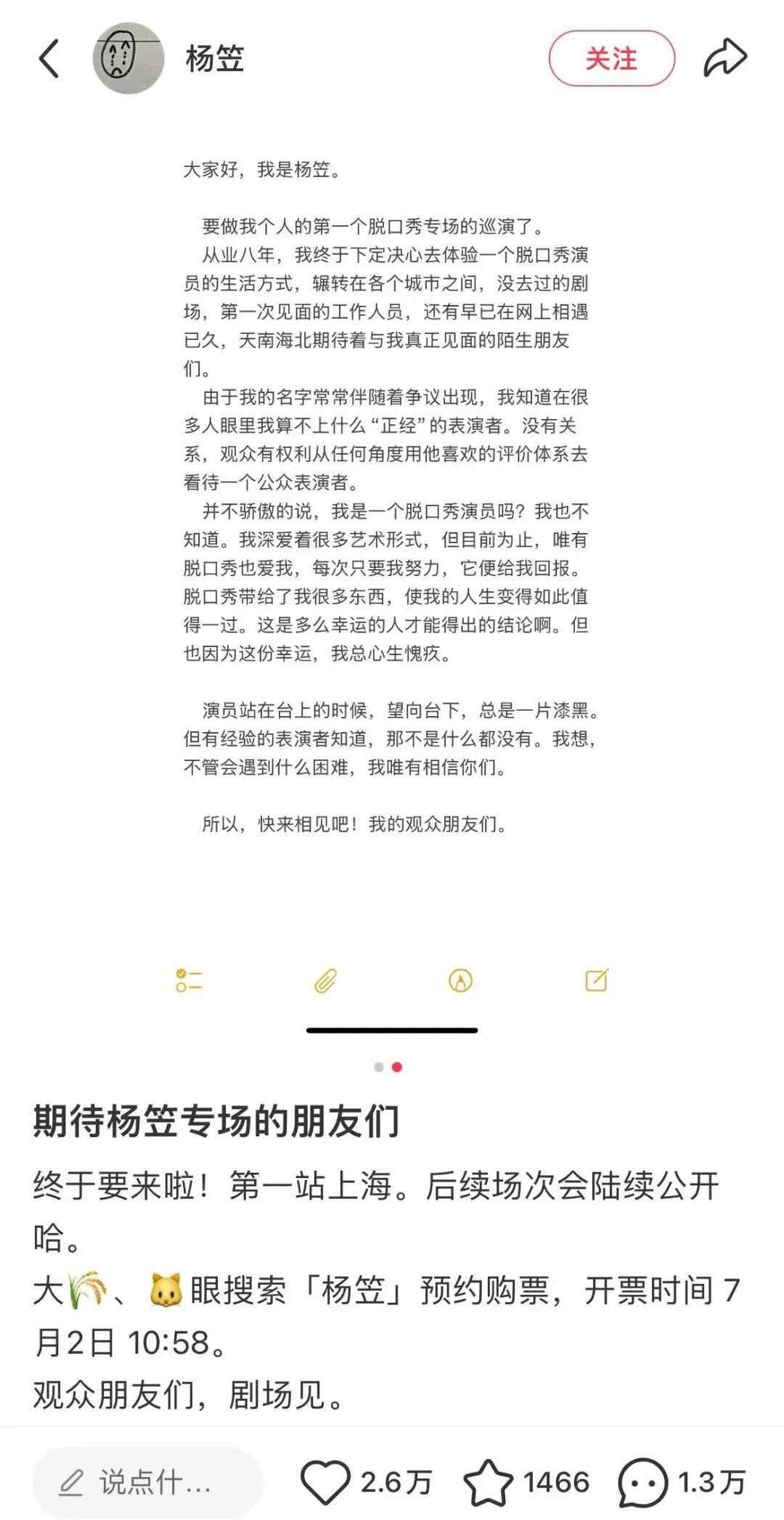 6月26日,杨笠宣布将开启个人的第一个脱口秀巡演。她提到从业以来的争议:“由于我的名字常常伴随着争议出现,我知道在很多人眼里我算不上什么‘正经’的表演者。没有关系,观众有权利从任何角度用他喜欢的评价体系去看待一个公众表演者。并不骄傲的说,我是一个脱口秀演员吗?我也不知道。我深爱着很多艺术形式,但目前为止,唯有脱口秀也爱我,每次只要我努力,它便给我回报。脱口秀带给了我很多东西,使我的人生变得如此值得一过。”